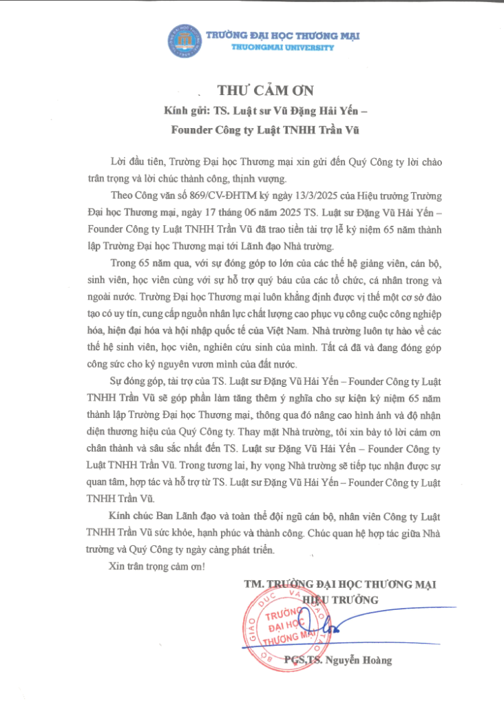 “Chúng tôi rất vinh dự được đồng hành cùng Trường Đại học Thương mại trong một dấu mốc quan trọng như lễ kỷ niệm 65 năm. Với Công ty Luật Trần Vũ, việc hỗ trợ giáo dục không chỉ là trách nhiệm xã hội mà còn là đầu tư cho tương lai. Mỗi sinh viên được tiếp thêm cơ hội học tập và phát triển hôm nay chính là lực lượng góp phần kiến tạo đất nước ngày mai.”
